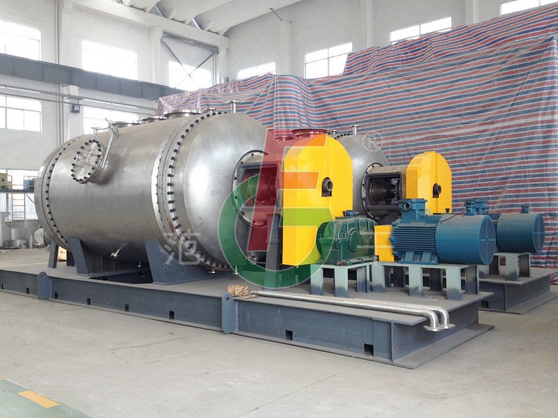 耙式真空干燥机是利用物料中的水份在真空状态下沸点降低的特点来进行干燥的设备。该设备用蒸汽夹套间接加热,水份受热蒸发并被及时抽除。在干燥机壳体内部,耙齿通过传动轴带动,耙齿端与轴线设计有一定角度,主轴通过正向反向转动使物料沿轴向移动以利于干燥及出料。